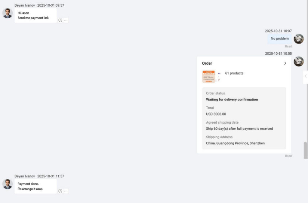 After confirming materials and samples, Deyan placed his first small test order across multiple SKUs.